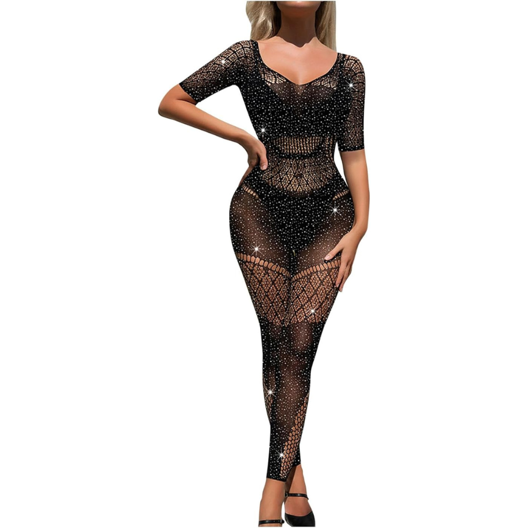 Glamorous black fishnet bodysuit with rhinestone embellishments
