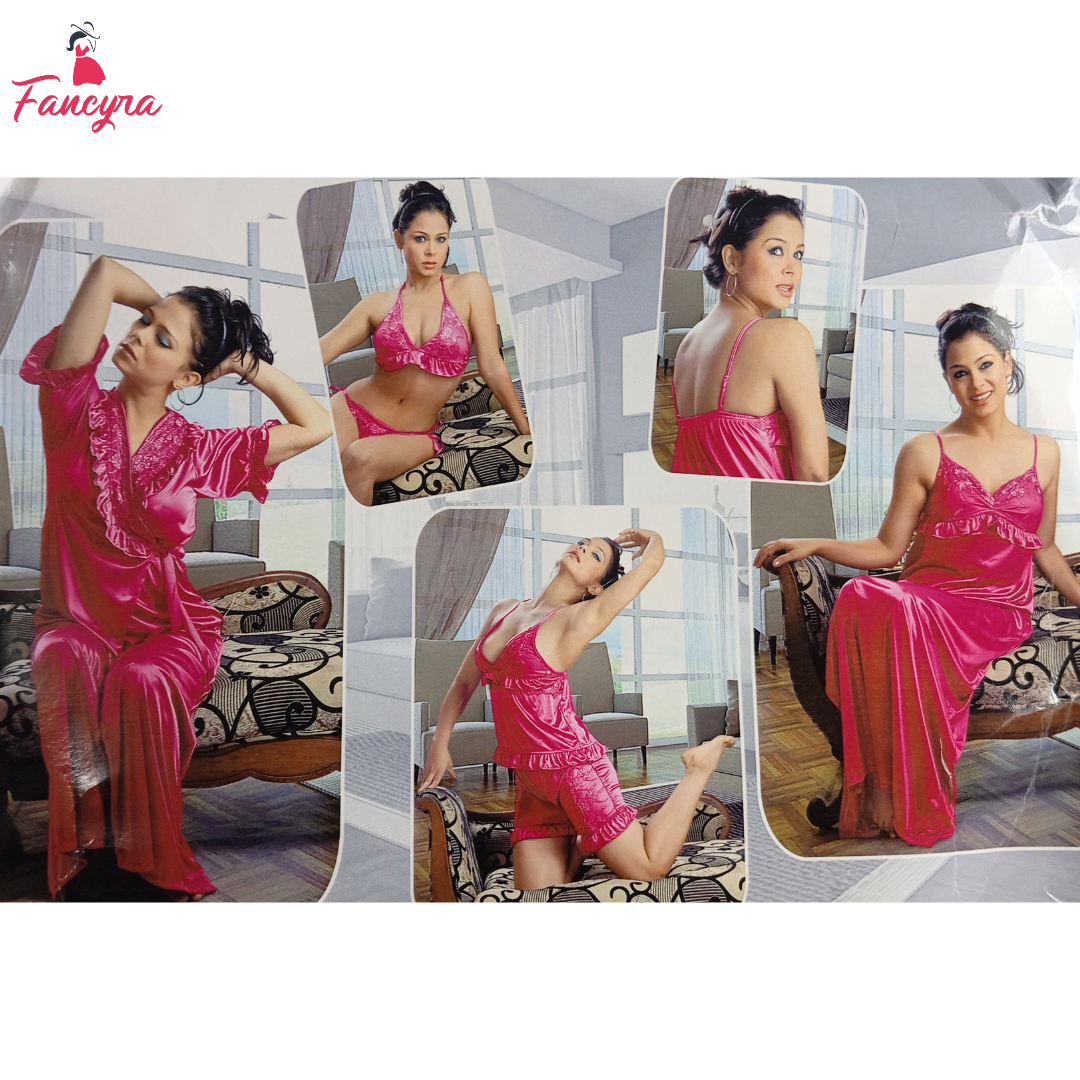 Indulge yourself in ultimate comfort and style with our Women’s 6-Piece Premium Satin Nightwear Sleepwear Set in an elegant Rose Pink Shade This luxurious set includes everything you need for a complete nighttime wardrobe — a stylish long robe with belt, a full-length nighty, a comfortable camisole top with matching shorts, a bra, and a panty.