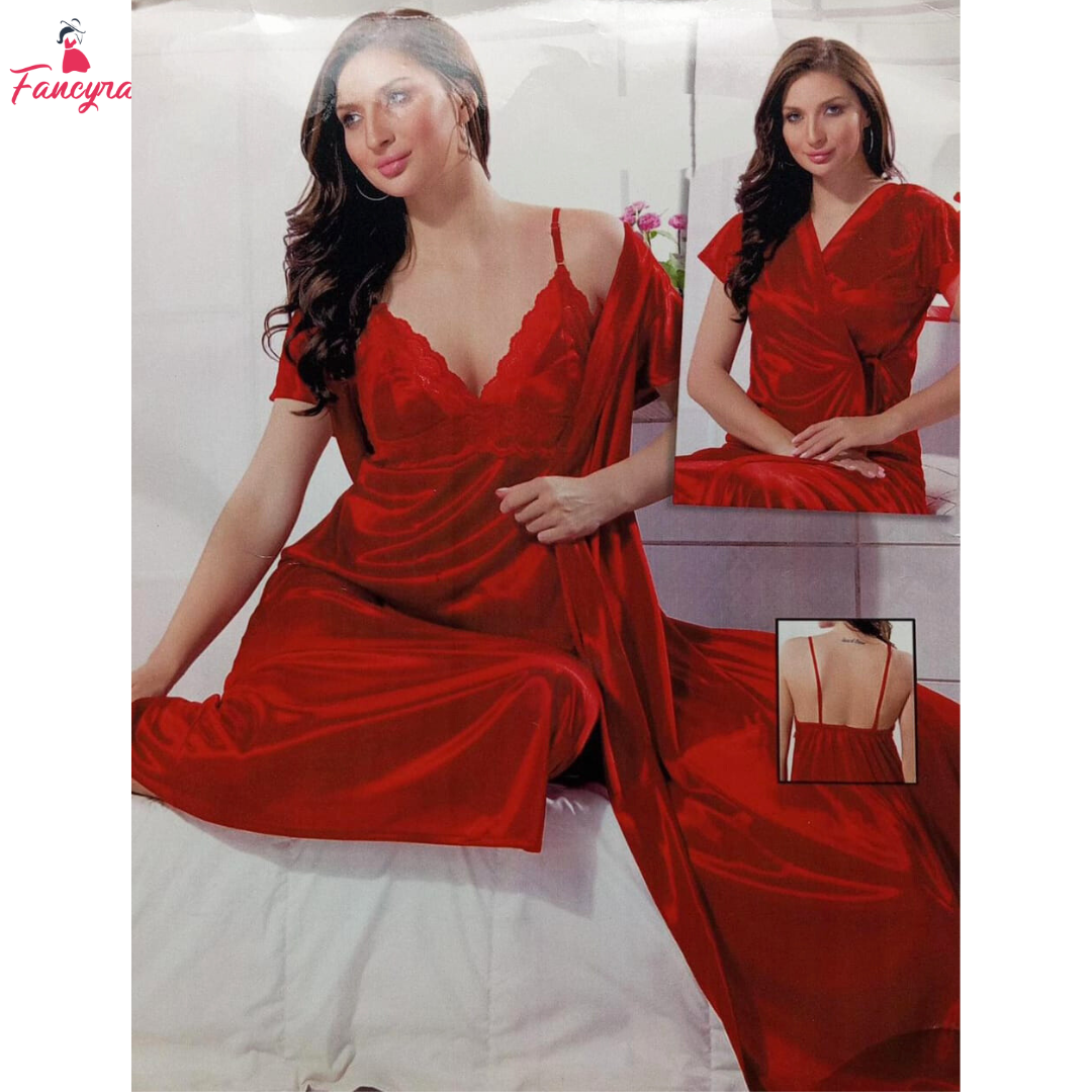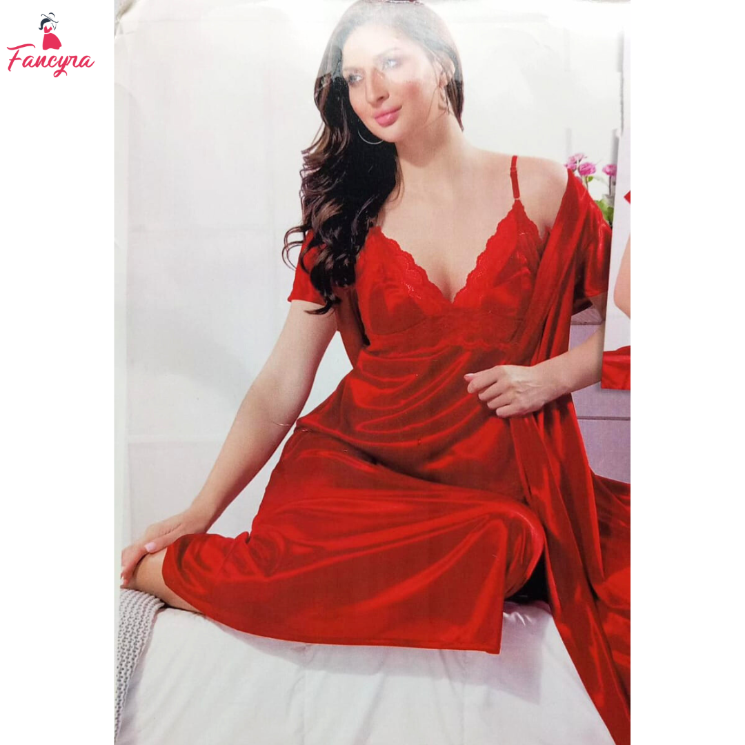 Indulge in luxury with this Satin 2-Piece Nightwear Set for Women, designed to make you feel glamorous and comfortable. This striking set in bold red includes a sleeveless nightdress with a deep V-neck, beautifully accented with delicate lace trim for a touch of elegance. The smooth satin fabric feels soft against your skin, offering a lightweight and breathable fit that’s perfect for all-night comfort. Paired with a matching short-sleeve robe, this set adds an extra layer of sophistication, making it ideal for relaxing at home or unwinding in style. Whether you’re treating yourself or searching for the perfect gift, this vibrant red sleepwear set blends allure, comfort, and luxury effortlessly. Slip into this chic ensemble and experience a night of restful sleep with a dash of boldness!