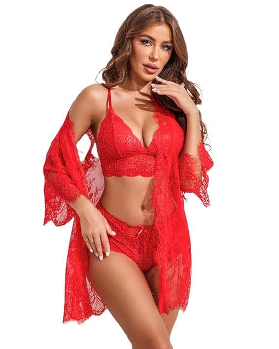 • ELEGANT DESIGN: Beautiful 3-piece floral lace lingerie set in vibrant red featuring a bralette top, matching bottoms, and a coordinating long robe